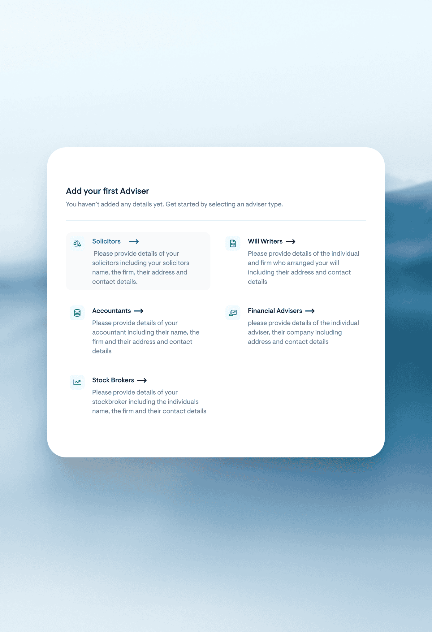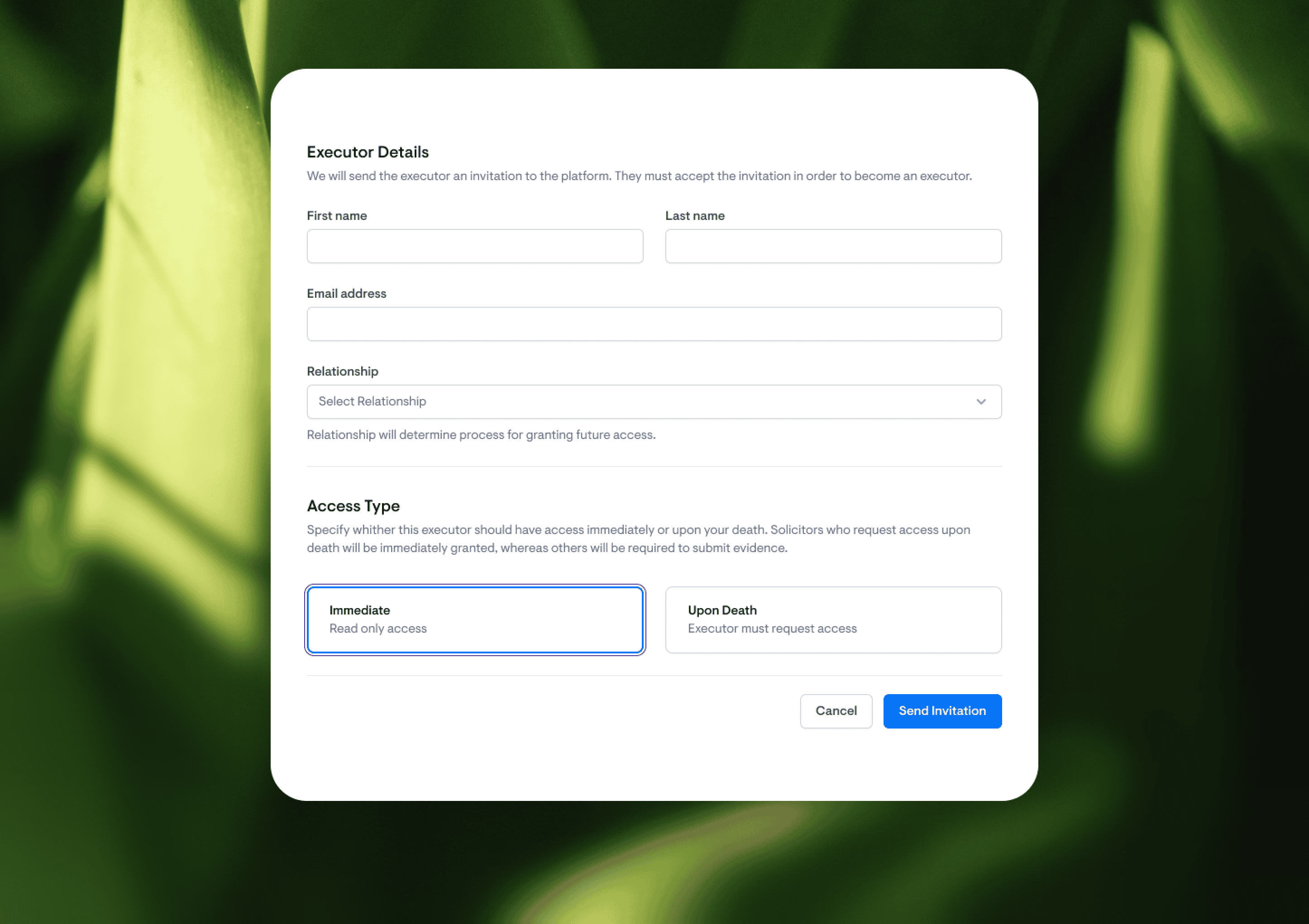 Security was an important factor in the project, and we provided 2FA for users during sign up. We also wanted to provide two options for executors being added - being able to see the assets immediately, or only upon notification of death. This ensures that customers can be in control over who can see their personal details.